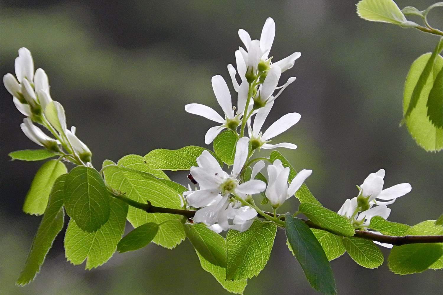 Allegheny Serviceberry or Amelanchier is covered in white flowers each spring, which turn into edible berries in June which is commonly known as the Juneberry. As the seasons continue, Finely-toothed, oval-like leaves start with bronze-purple in the Spring, maturing to a nice green and finish off in a reddish-orange in the Fall. It is upright, perfectly oval form adds height in small gardens and provides nice structure during winter. This is the tree form grown as a single trunk.