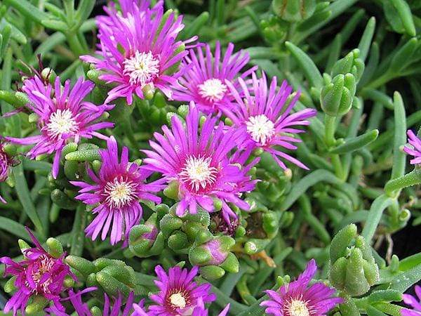 The Delosperma Cooperi, also known as Cooper's Hardy Ice Plant is a fast spreading, mat forming perennial with bright, neon colored flowers. The purple flowers are daisy like in shape and bloom in multiple, sometimes hundreds at a time. This deer resistant, drought tolerant plant is stunning when planted en masse. Attracts butterflies.