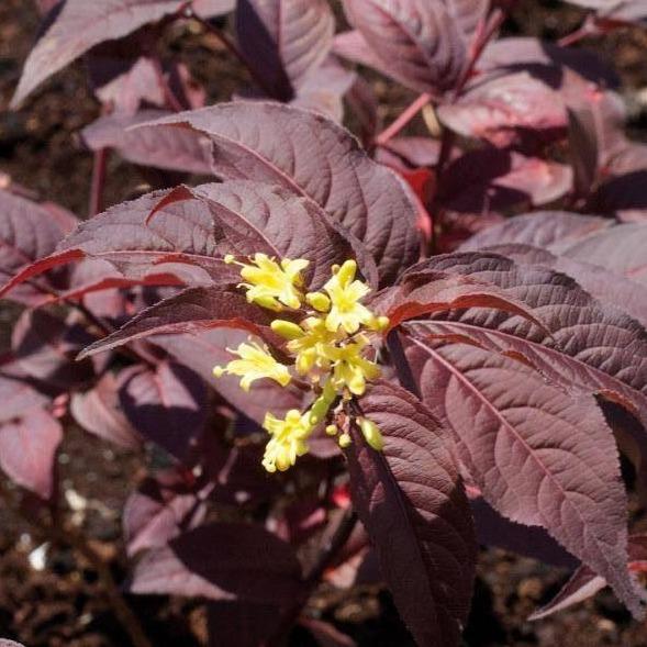 Diervilla Nightglow Shrubs or Diervilla splendens 'El Madrigal' are deciduous shrubs with dark red foliage and striking yellow blooms. Also known as Bush Honeysuckle, Diervilla Nightglow Shrubs' foliage turns an even deeper red during the fall. They are easy to care for and popular placements include walkways, patios, and cornerstones of landscapes.