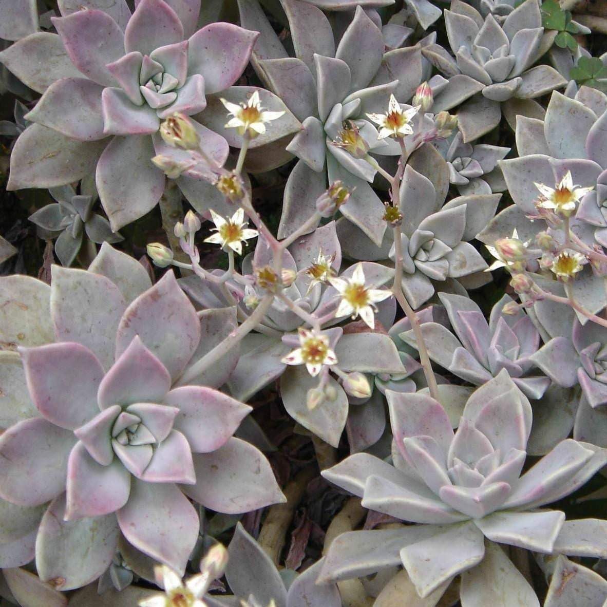 Native to Mexico, Variegated Ghost Plant or Graptopetalum paraguayense is a fast growing and low maintenance succulent ideal for hanging baskets and rock gardens. The color of its leaves vary from yellow to pink in bright light and blue, purple, and silver in the shade. Shaped like a star, Variegated Ghost Plants are an extremely popular house plant that grow so fast you will be amazed at its progress each day.