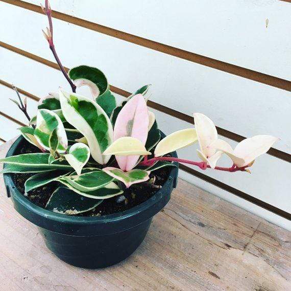 Krimson Queen wax plant has variegated, green and pinkish-white leaves that emerge on cascading rope-like vines, making this Hoya perfect as a hanging plant. Krimson Queen Hoya will eventually produce beautiful clusters of star-shaped pink flowers as it matures.
