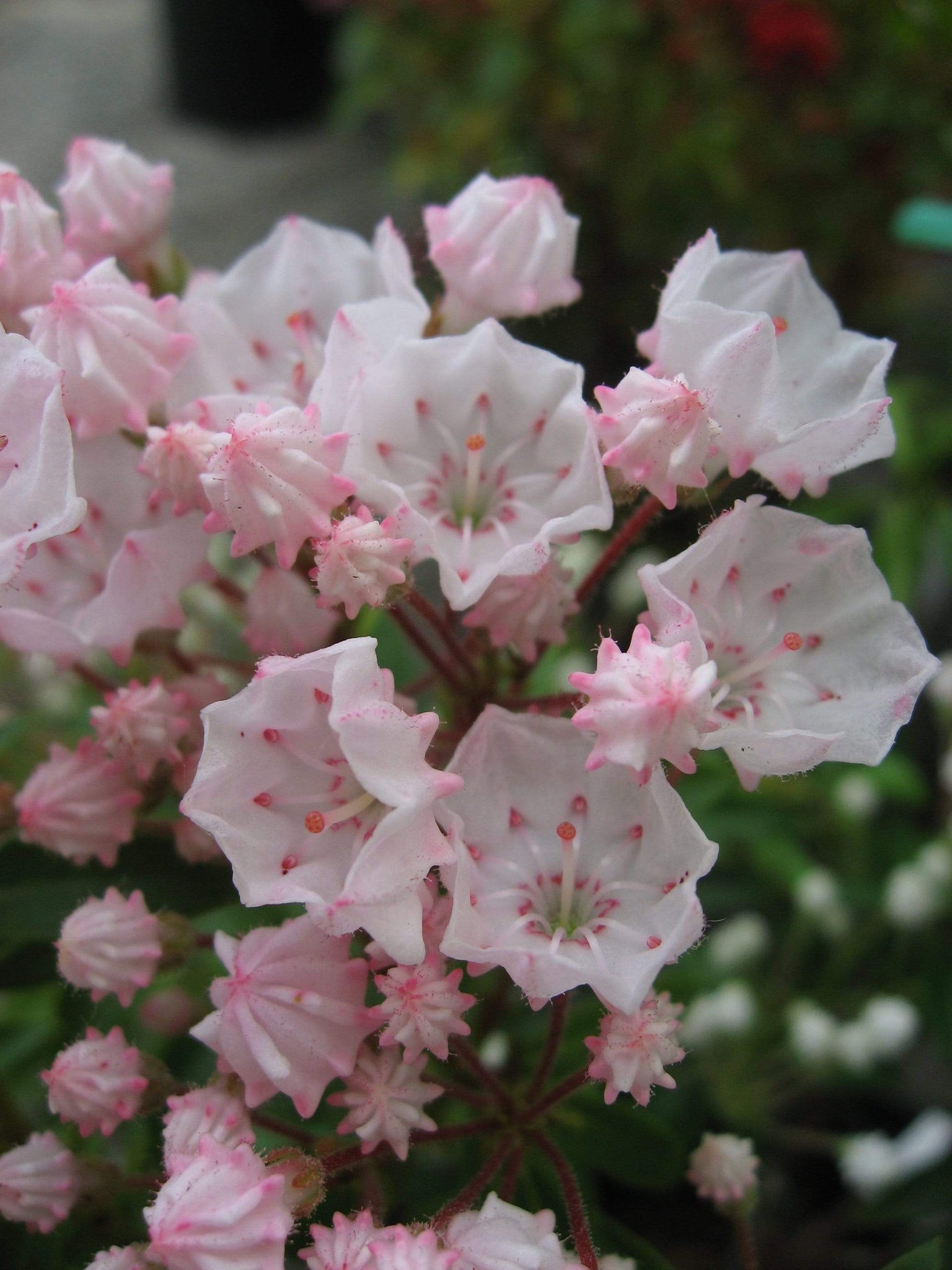 Kalmia latifolia Elf, aka Dwarf Mountain Laurel, flowers in May and are light pink with white overtones and pink center. The leaves of Elf Mountain Laurel Shrubs are long, narrow, deep evergreen.