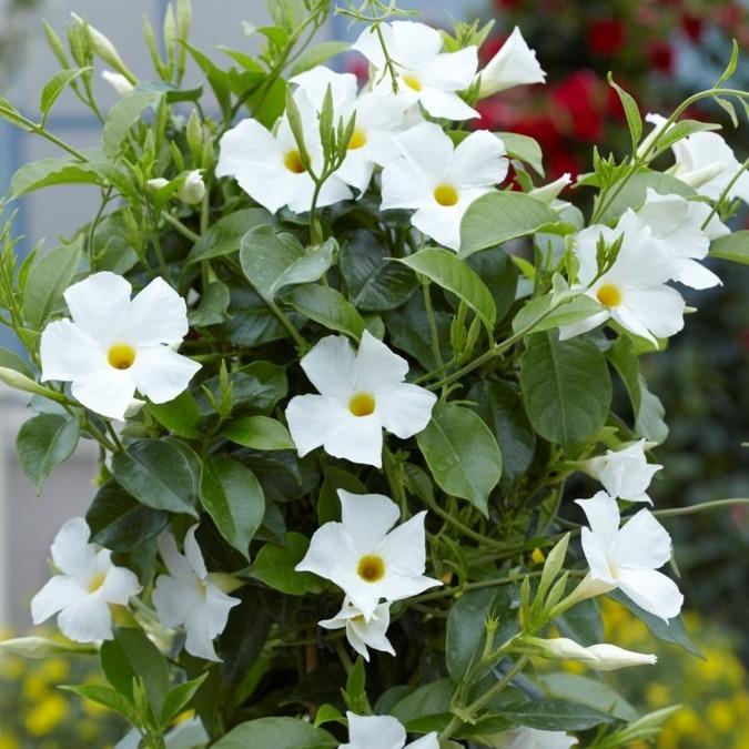 This tropical twining vine grows well with other flowers, and can grow up to heights of 20 feet with the proper care and attention. Mandevilla grows well in containers and in planter beds.