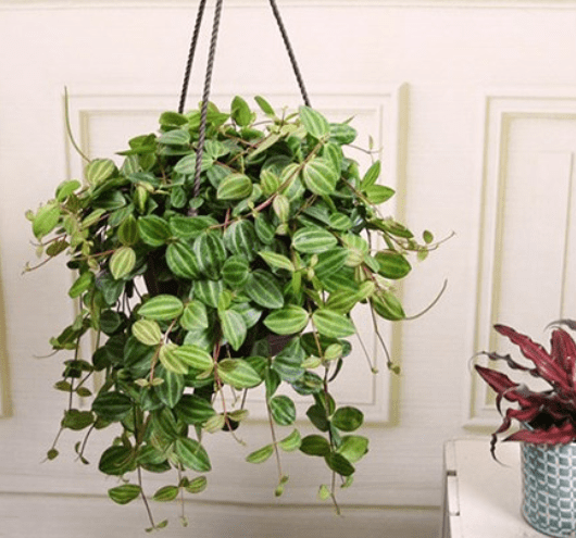 Peperomia puteolata or Parallel Peperomia produces almond-shaped leaves that are variegated with alternating stripes of dark and light green. The leaves emerge in groups of three or four, and stand out against the upright, reddish stems.