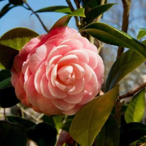 Pink Perfection Camellia Japonica Shrubs or Camellia japonica 'Pink Perfection' are a very popular evergreen shrub with gorgeous pale pink flowers that bloom in early spring. Compact, with a moderate growth rate. Great as a patio plant, screen or in a mixed border