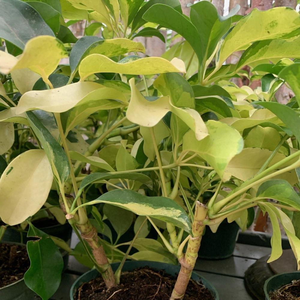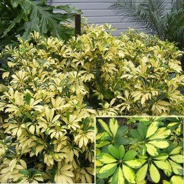 Schefflera Arboricola, or Umbrella Tree Plants, brighten whatever space it's planted in. These yellow and green variegated plants will do well inside with bright indirect light from a windowsill or in very low, fluorescent light.