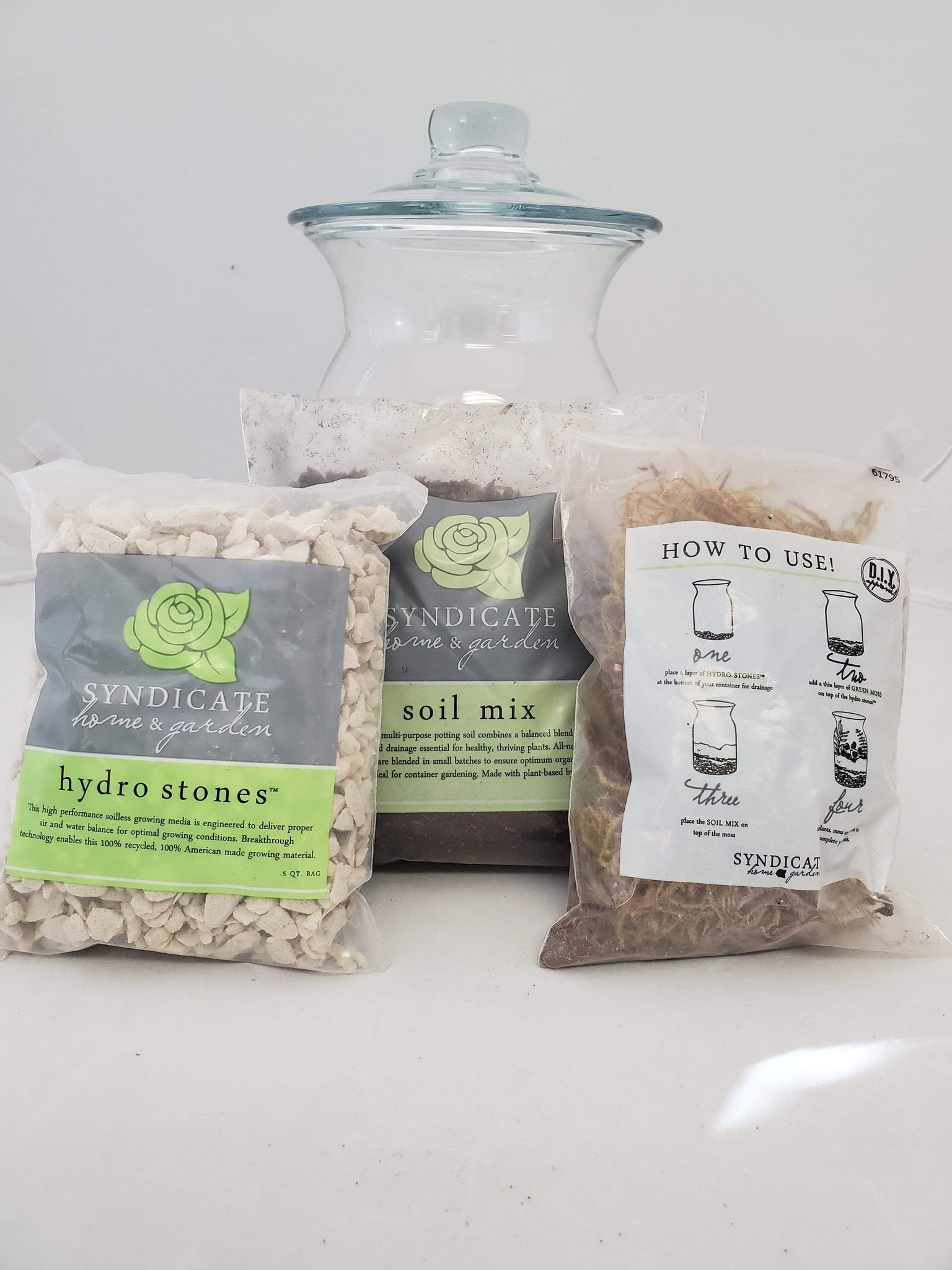 This boxed kit includes an 8" glass vessel and lid, bag of soil mix, bag of moss, and a bag of hydrostones.