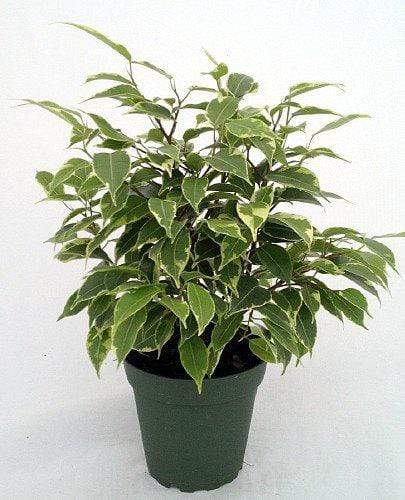 Variegated Ficus benjamina Plants are one of the most common houseplants. The green and cream-colored leaves add color to your decor. They can be trained as a tree with a clear trunk or as a bush with leaves from the top of the plant to the soil level. These plants need bright, direct light and they prefer to dry out some between watering. It's best to keep this Variegated Ficus benjamina in the same location because any change in moisture, light or location will cause the plant to drop some of its leaves to adjust. New leaves will quickly grow in to fill the tree.